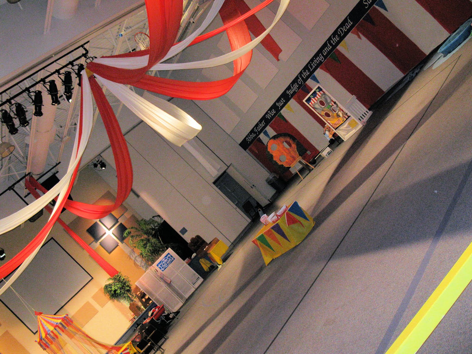 Here's a preview picture of the "Big Top" for Kid's Club. This is usually our Contemporary Worship Center (and rec room) so if you can ignore the theater lighting and the basketball hoops and envision this room filled with clowns, balloon artists, face painters and excited children playing carnival games, you'll be able to picture my week next week!